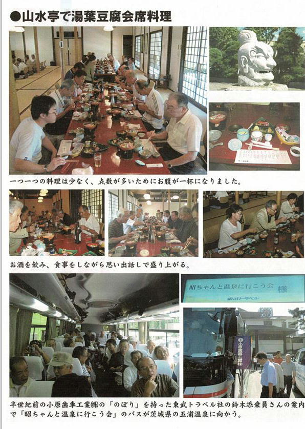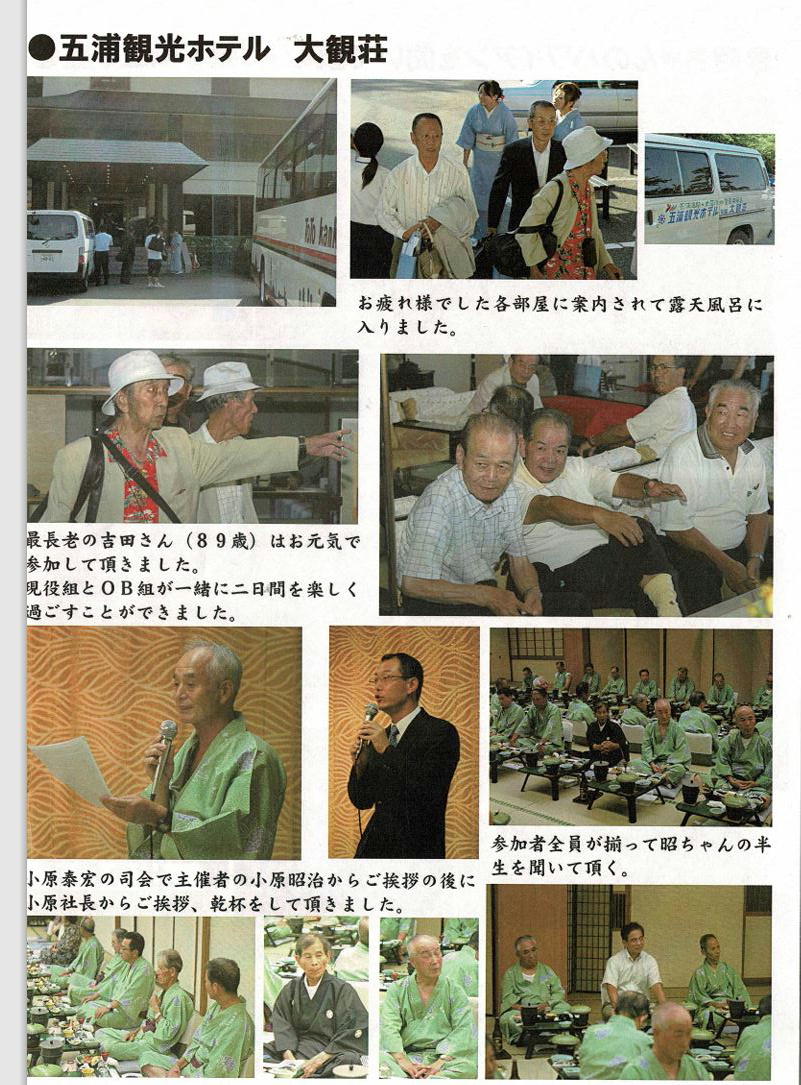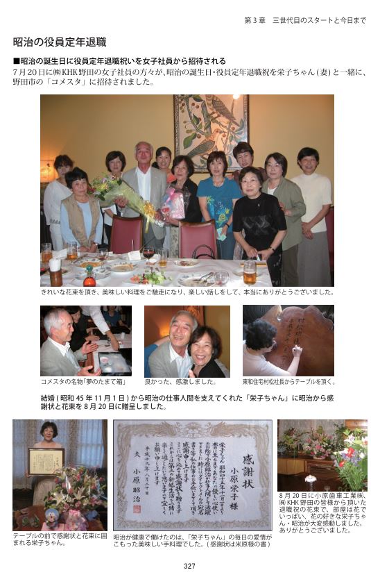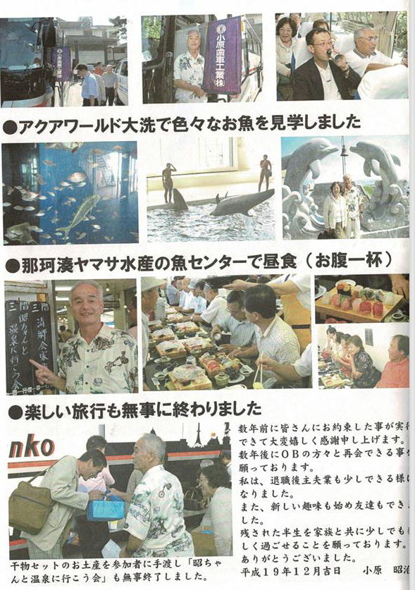 ■昭治の定年退職・昭ちゃんと温泉行こう会 ■昭治の定年退職 ■昭ちゃんと温泉に行こう会 ●平成19年(2007)9月21~22日に会社関係・小原昭治の家族の方々が小原昭治の定年退職(2007年8月20日)を祝って「昭ちゃんと温泉に行こう会」に42名の方が参加して頂きました。KHK野田の工場見学後五浦観光ホテルに宿泊、後観光して、楽しい旅行で小原昭治の思い出多いイベントでした。 下記の動画・旅行記を見ていただければ幸いです。 2024年3月小原昭治 ・「昭ちゃんと温泉に行こう会」動画(約9分間)