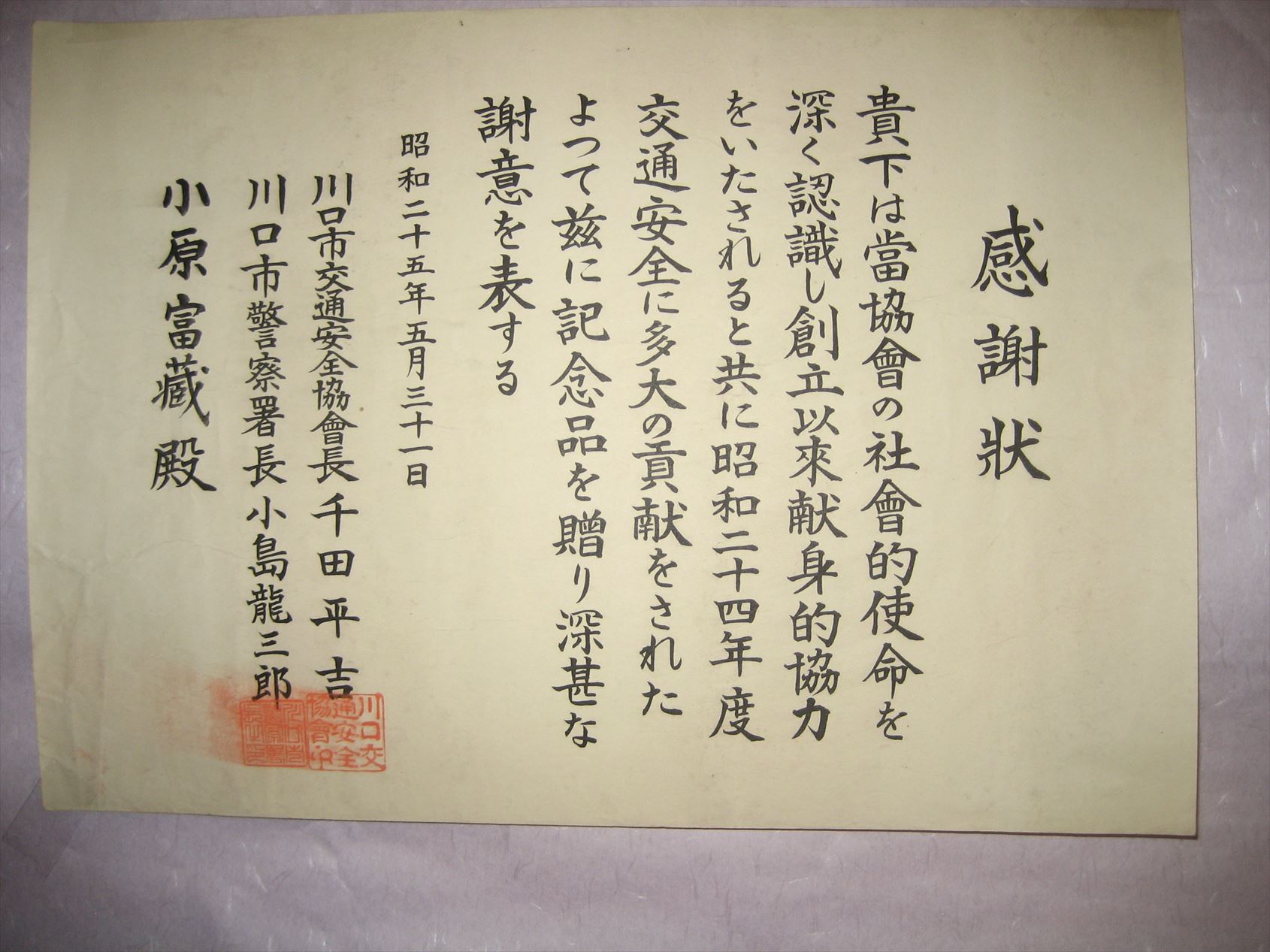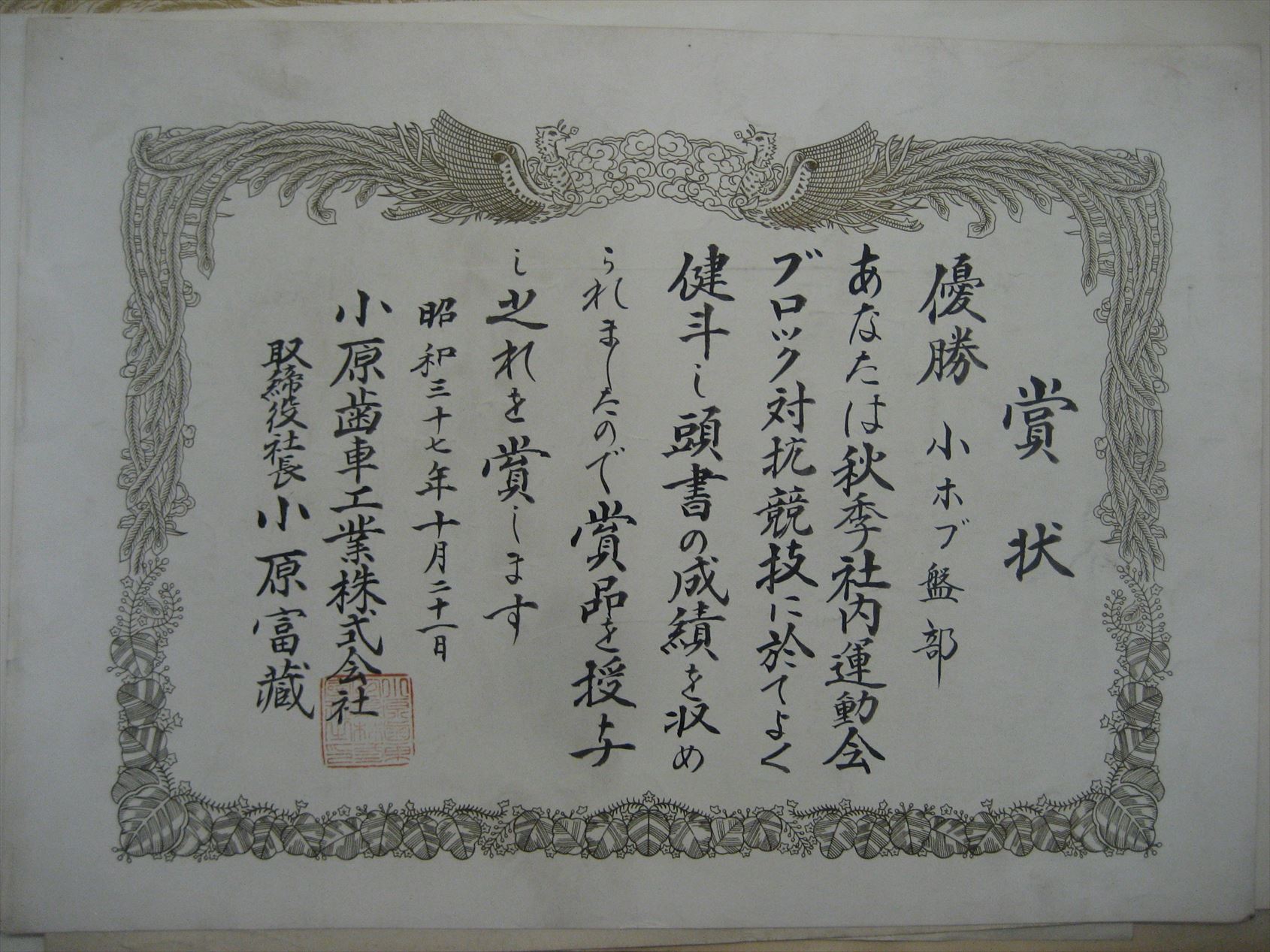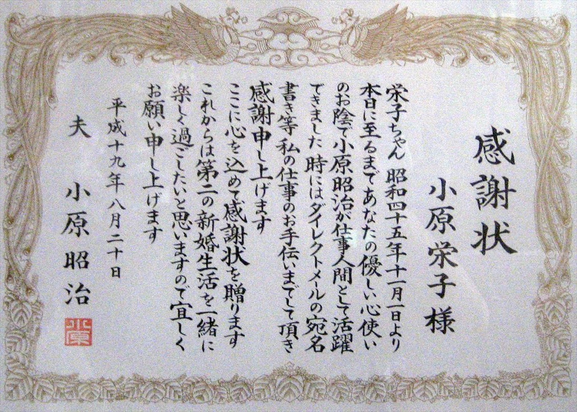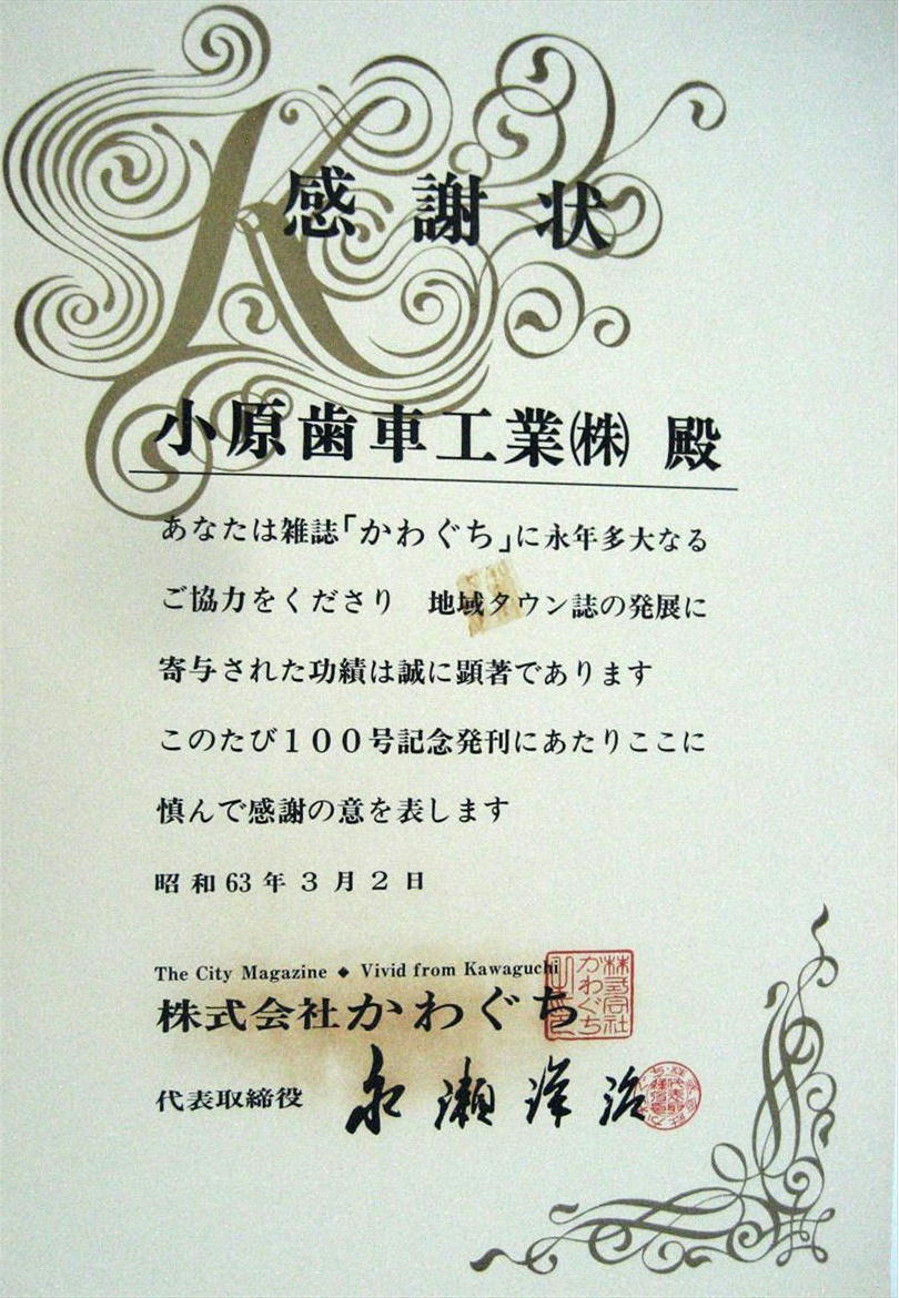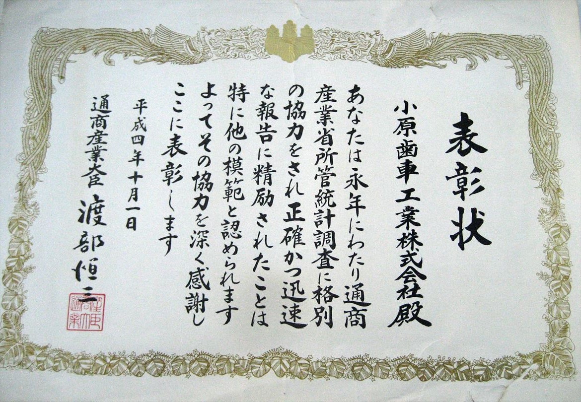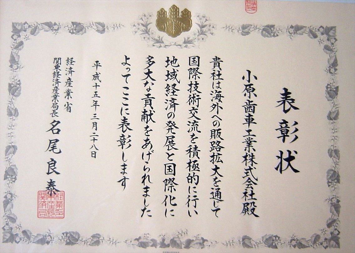 ■表彰状 ・感謝状等 ●小原歯車工業㈱に関係する表彰状・感謝状等の写真を一部紹介してます。 他は、「小原歯車工業㈱の歴史を知って頂くホームページ」の専用ノートパソコンの「5-7 表彰状・感謝状等」フアィルを検索願います。 ●表彰状・感謝状等