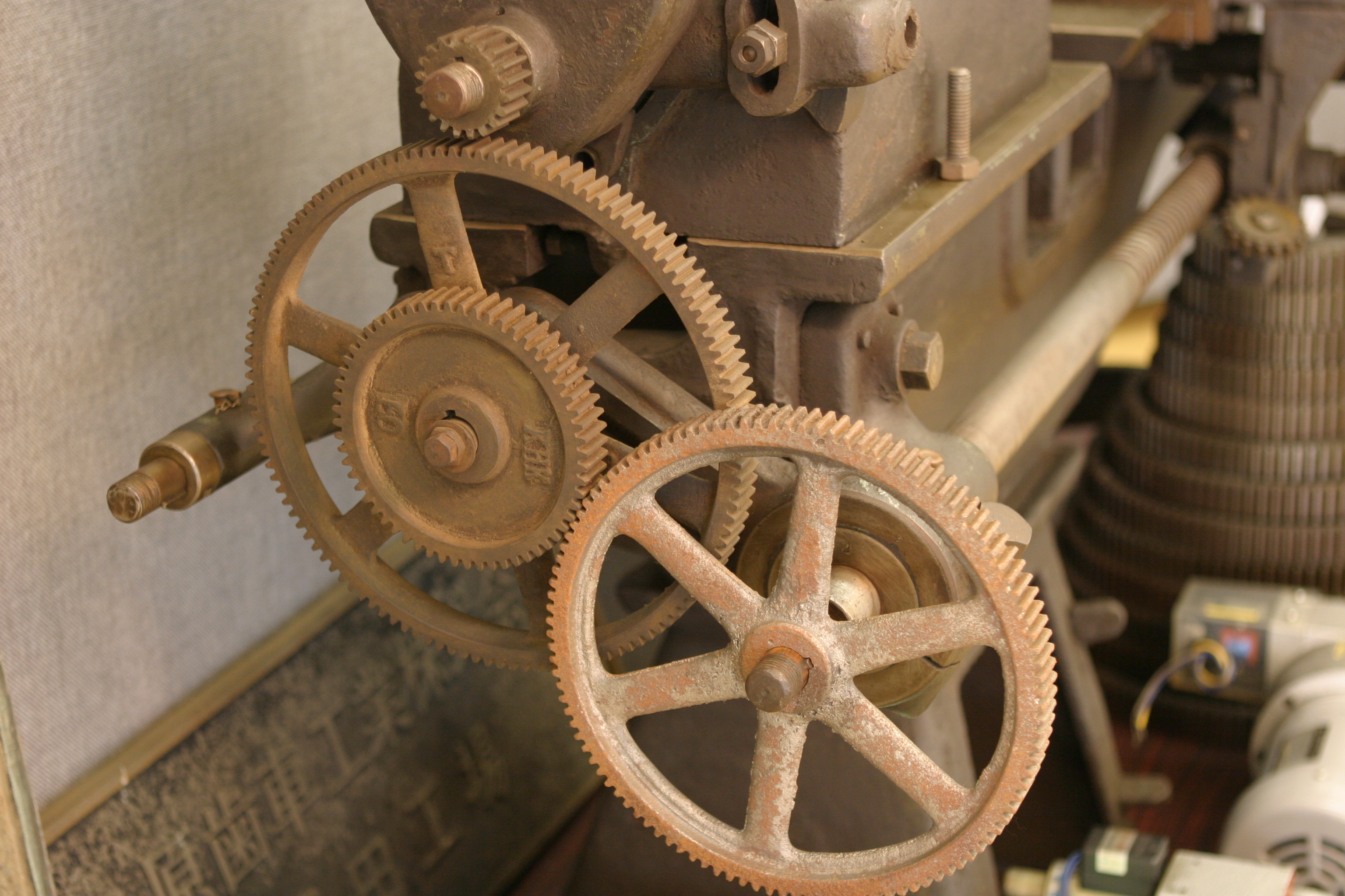 ●初期のベルト掛け旋盤の替え歯車を利用してねじ切り加工をする。
