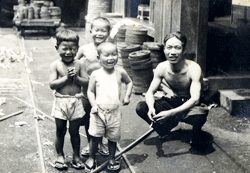 ●旋盤の替え歯車の素材写真の右二人の子供は、小原信治(後)小原誠治(前)です。後ろに「旋盤替え歯車」の素材があります。