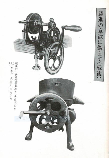 ●戦後(1945年後)の一時的に製造販売した自社製品手動のグラインダー・旋盤のバイト製造の「手動ふいご」(当時社内でも使用)、写真は有りませんが、小原昭治の記憶では「手動のボール盤」がありました。当時はモーター付の製品は、技術的・高価で製造不可でした。
