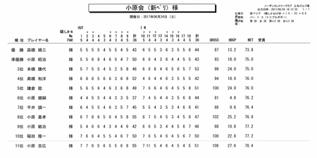 ●小原会600回記念ゴルフコンペが平成29年6月24日ノーザンカントリークラブ上毛ゴルフ場で参加者11名で行われました。梅雨の中休みで好天気に恵まれ楽しいゴルフ会ができました。ハンデ戦の優勝者平井誠一様、新ペリア戦優勝者高橋順三様でした。宿泊組5人と家族は、旅館松本楼で一泊後おもちゃと自動車博物館を見学して帰りました。皆様のご協力で楽しいゴルフコンペが出来ましたことをお礼申し上げます。一日小原会会長小原昭治