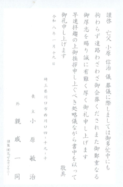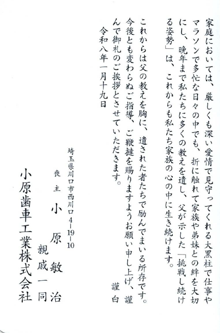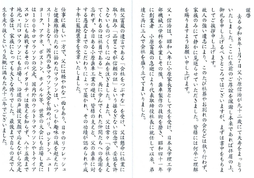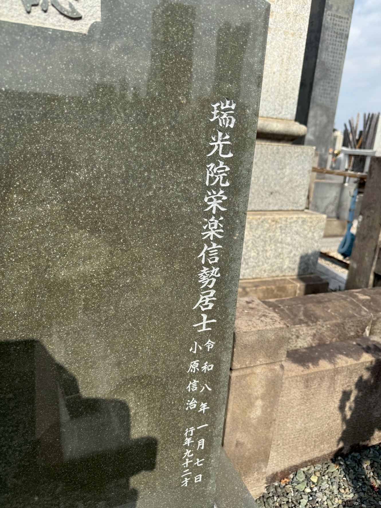 小原信治は、令和8(2026)年1月7日に子供達3人を含め親戚の方々に見送られて亡くなりました。川口市1月18日通夜・19日告別式を信治の遺言に従い家族葬を子供三人が立派に行われました。2月22日に四拾九日法要を行ないました。