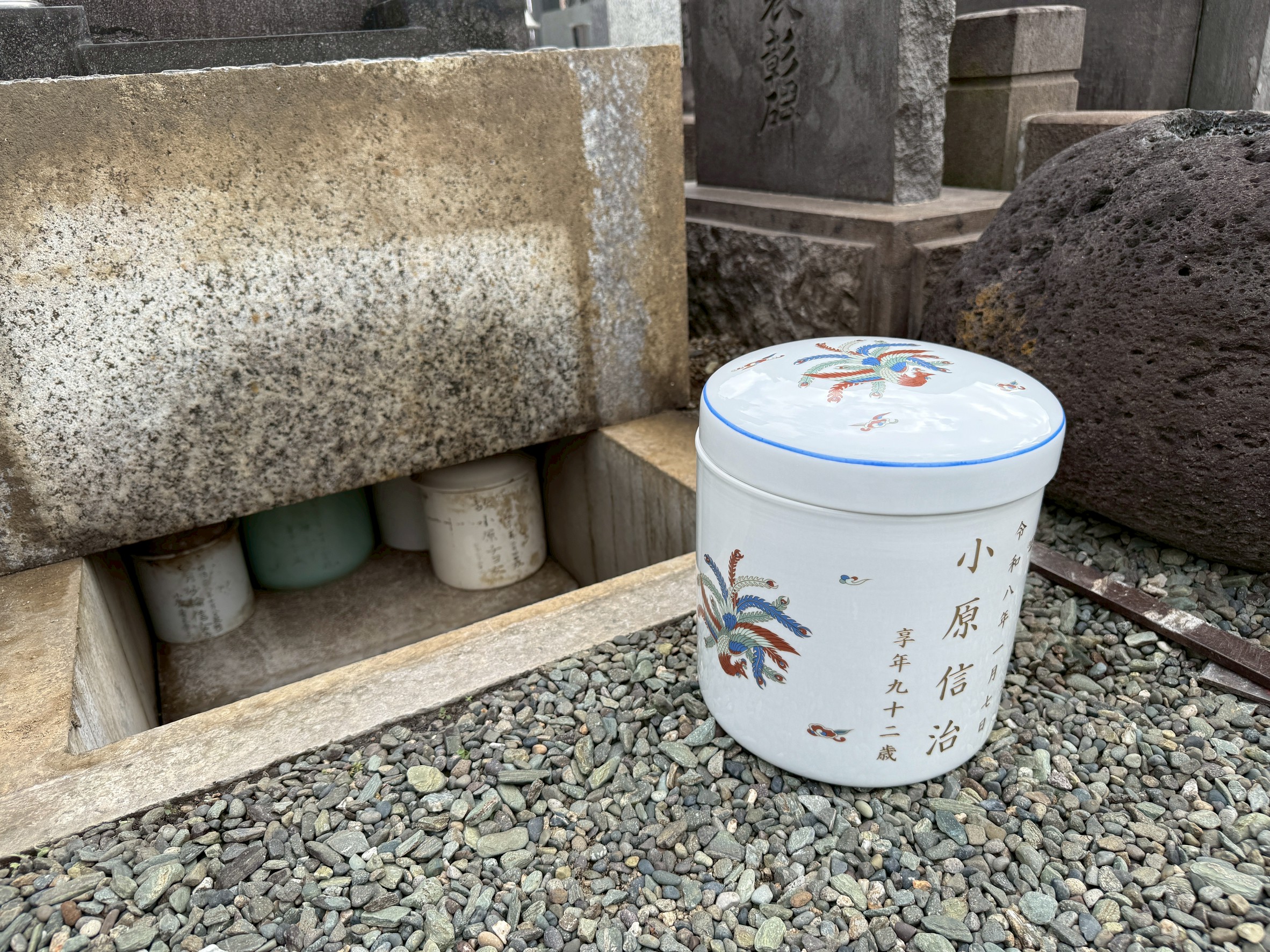 小原信治のお骨は、とり年のきれいな絵が描かれ、約50年ぶりに父富蔵・母ふでの隣に安置されました。